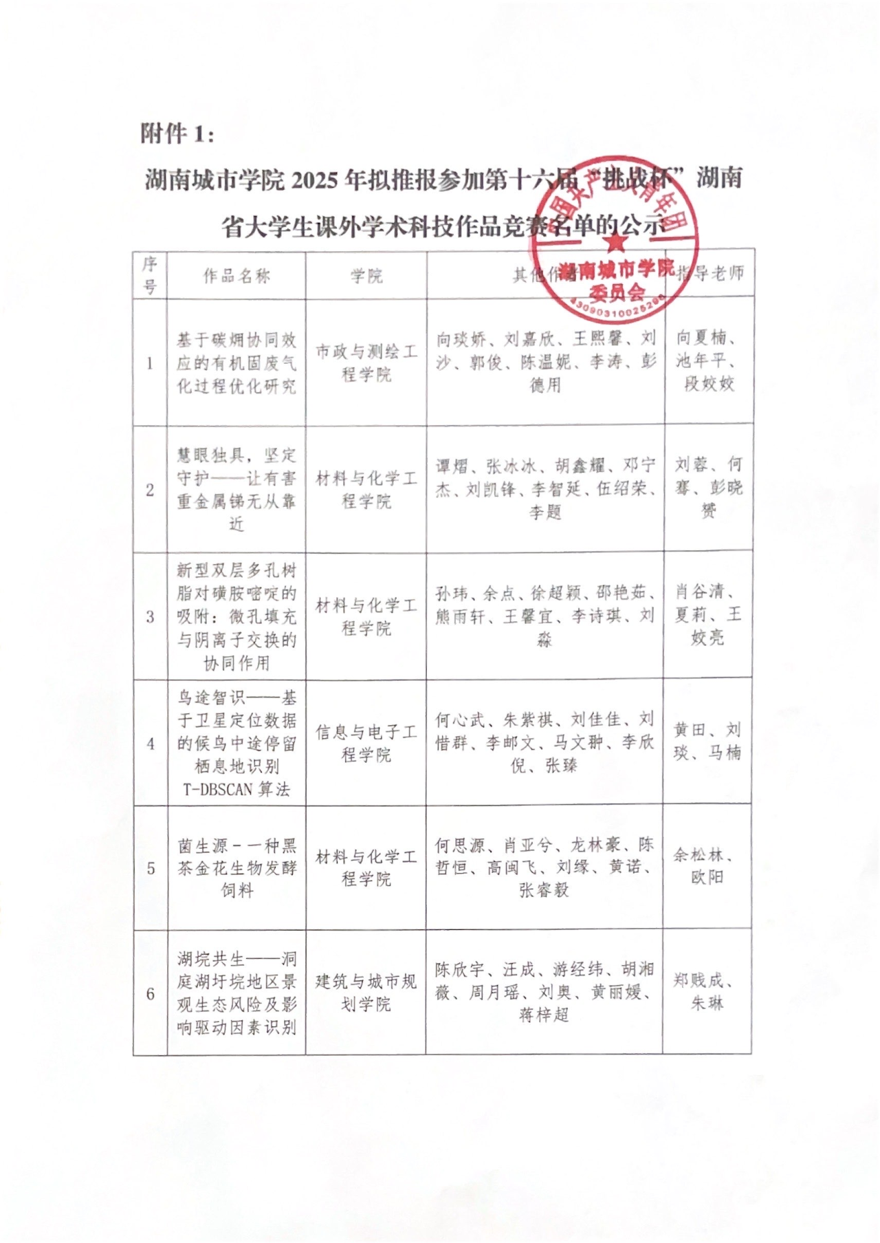 0638太阳集团官网2025年拟推报参加第十六届“挑战杯”湖南省大学生课外学术科技作品竞赛名单的公示