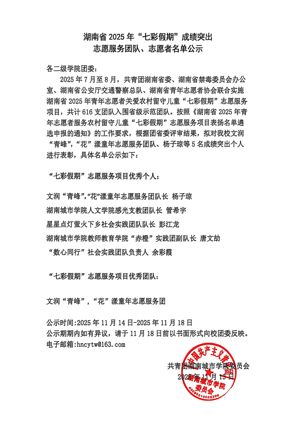 湖南省2025年“七彩假期”成绩突出志愿服务团队、志愿者名单公示