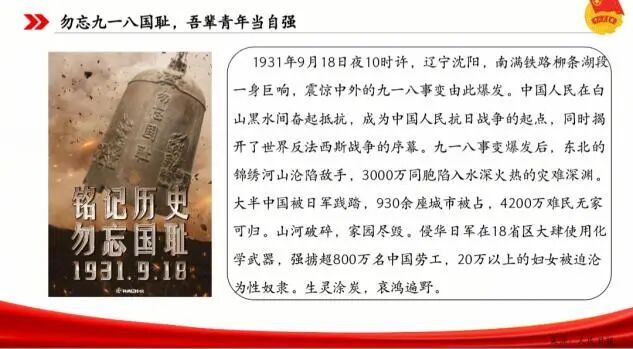 “勿忘国耻,吾辈自强!”市政与测绘工程学院2202601团支部易谱臣学习本次政治学习后表示:从“九一八”事变爆发到日本侵略者无条件投降,中国进行了长达14年的抗日战争,以3500多万军民伤亡的代价赢得了自鸦片战争以来抗击外敌入侵的第一次完全胜利。历史是最好的教科书,也是最好的清醒剂,历史烛照未来:正义不可战胜,中国人民不可战胜!牢记“九一八”,让警钟长鸣心中,是对历史最好的纪念。